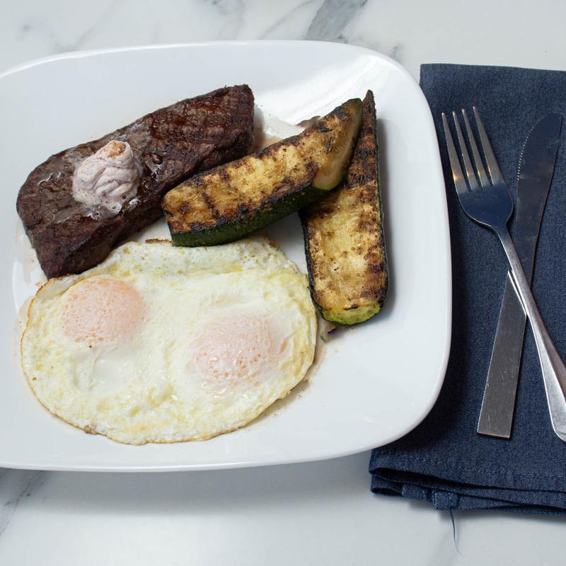 Bistro steak topped with red wine butter, 2 eggs, toast, choice of side.