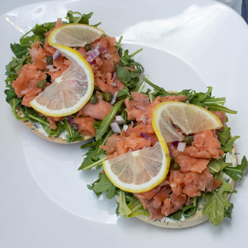 Dill cream cheese spread, red onion, capers, baby arugula, shaved lemon.