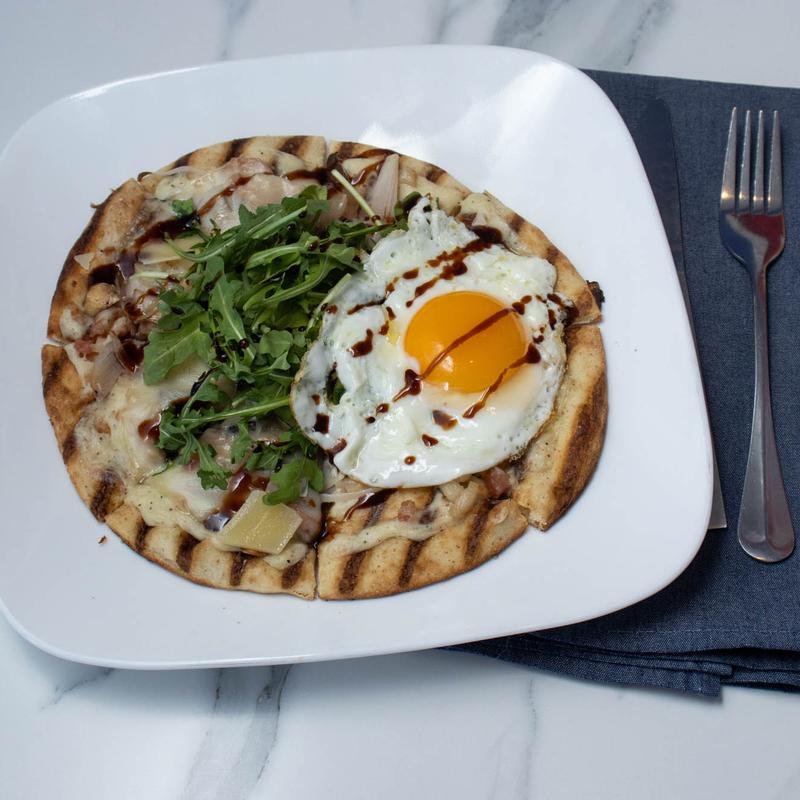 Bacon, provolone cheese, parmesan cheese, roasted mushrooms, roasted shallots, bechamel sauce, sunny side up egg, baby arugula, balsamic drizzle.